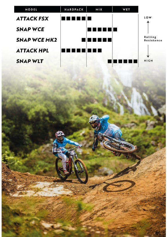 Use the Attack series for lots of speed and the Snap series for more aggressive riding and lots of grip!